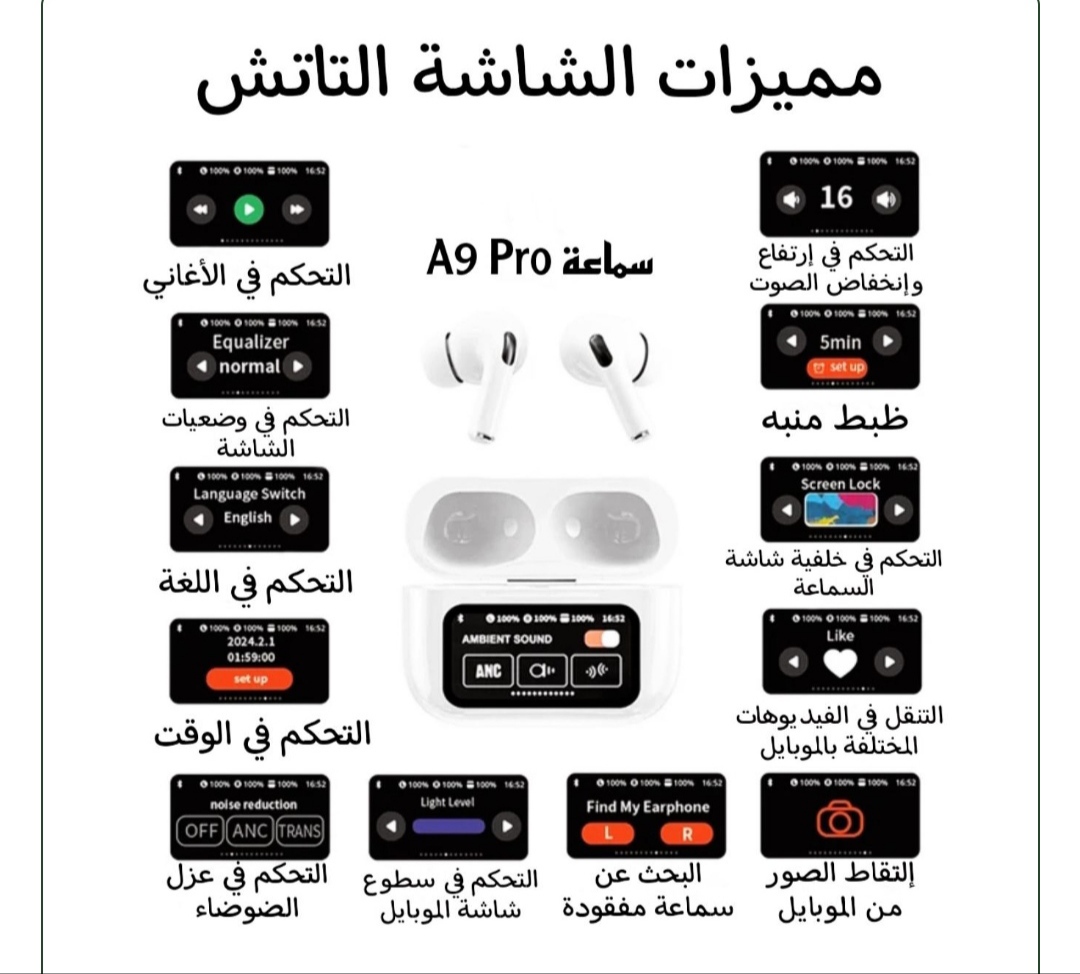 ألكمية مش كبيرة🚨 إيربودز A9 PRO تاتس بتقنية عزل الضوضاء – شياكة وجودة في تجربة واحدة! 🎧🔥 ✨ شاشة ملونة تاتش على العلبة لتسهيل التحكم بلمسة واحدة. 🔊 عزل ضوضاء بأربع وضعيات لمكالمات نقية بدون دوشة. ⚡ كونكت تلقائي بمجرد فتح العلبة + عرض نسبة الشحن على الشاشة. 🔋 شحن وايرلس + إيقاف تلقائي عند نزعها من الأذن. 💧 مقاومة للمياه والعرق – مثالية للرياضيين. 🎨 تصميم شيك وفخم، قطعة فنية تضيف لشياكتك. 👌 راحة، نقاء، وتقنية في سماعة واحدة!